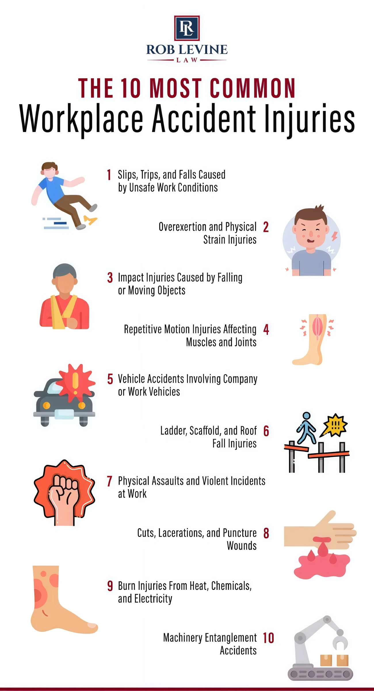 This guide outlines some of the most common workplace accident injuries and how they happen. Working with an experienced workers’ compensation lawyer can help ensure your claim reflects the true extent of your injury and that you receive the maximum compensation available. Contact Rob Levine Law today for a free consultation.